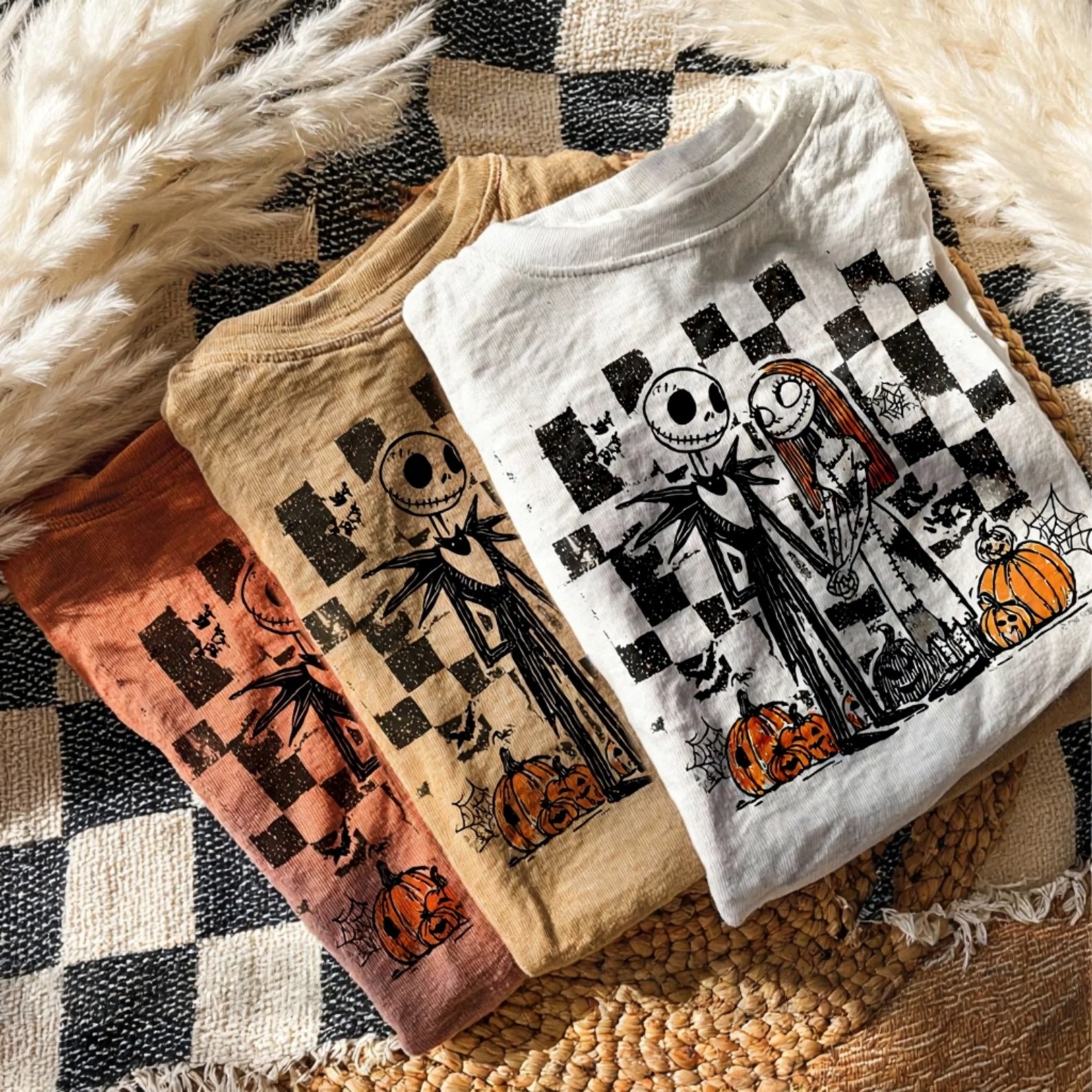 A spooky season essential for Skellington lovers... this Jack & Sally pumpkin tee with checkered print is perfect for Halloween nights, pumpkin patches, and cozy fall fits.