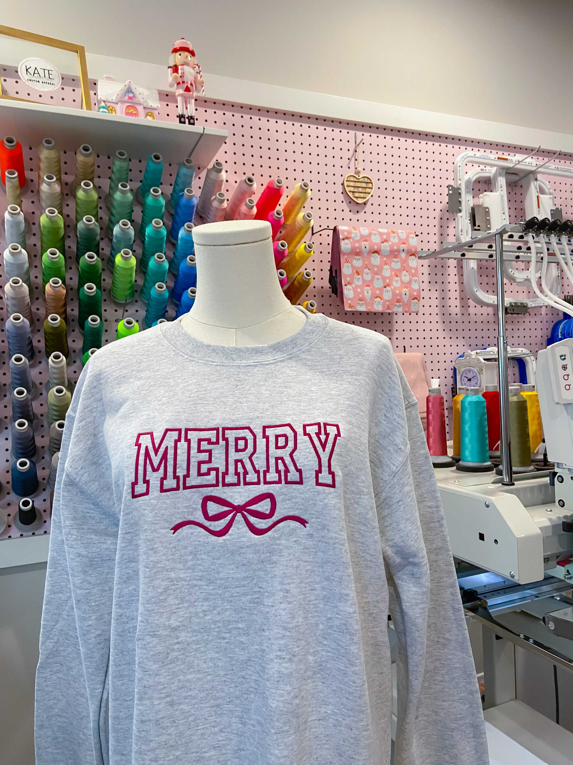 Elevate your festive wardrobe with our Merry Bow embroidered Sweater, designed to bring joy and style to your holiday celebrations! This chic sweater features a bold "MERRY" stitched in a trendy varsity font across the chest, complemented by a delicate ribbon stitched below for a playful touch. The standout feature is the luxurious velvet bow applique on the wide bottom seam, making it a must-have piece for the season!