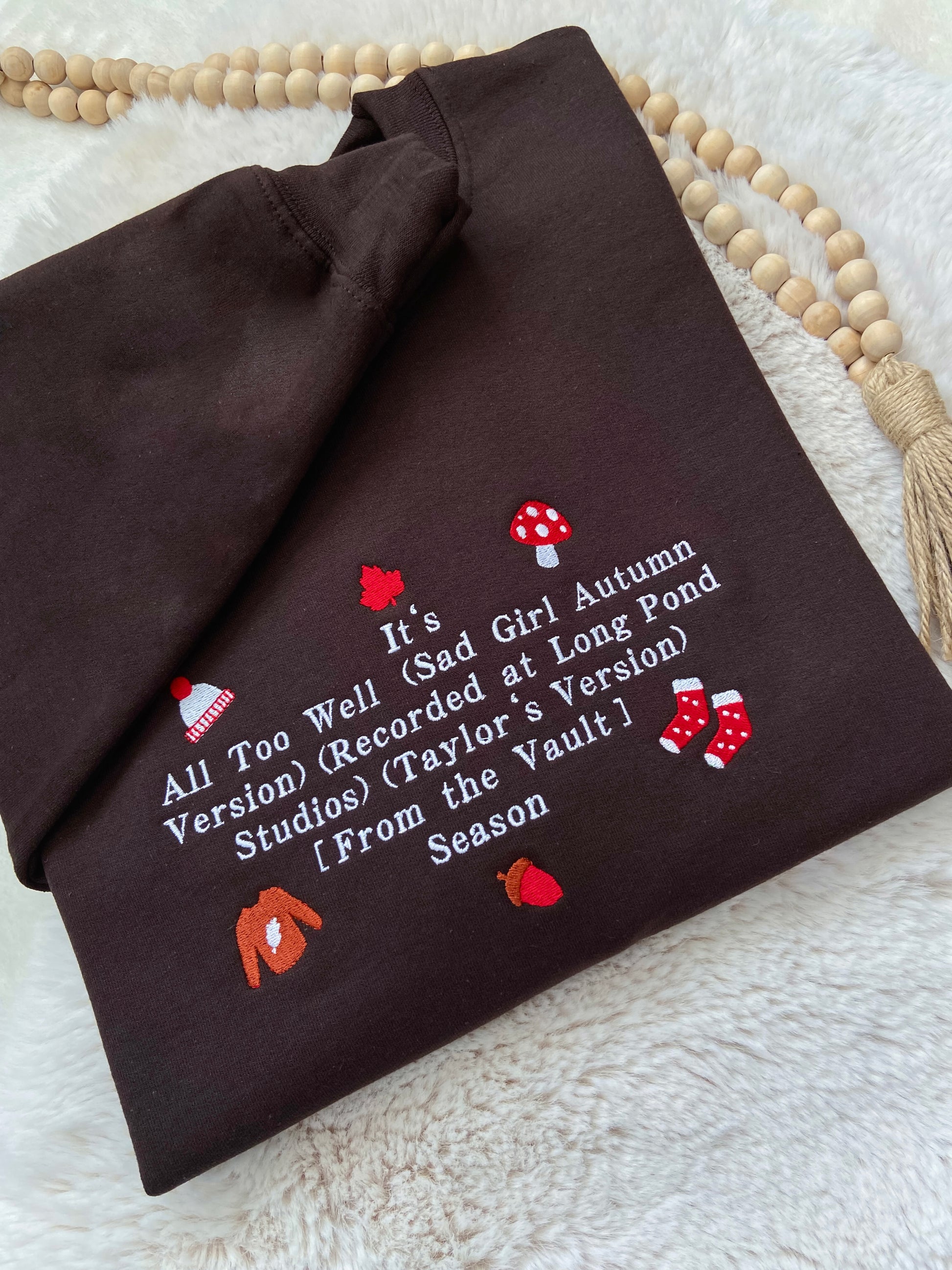 Embrace the cozy vibes of Fall with this embroidered sweater made for chilly nights, candlelit journaling, and long walks under golden leaves. The minimalist text embroidery, paired with tiny autumn-themed details like a knit hat, socks, and acorns, makes this piece a perfect mix of nostalgia and comfort.